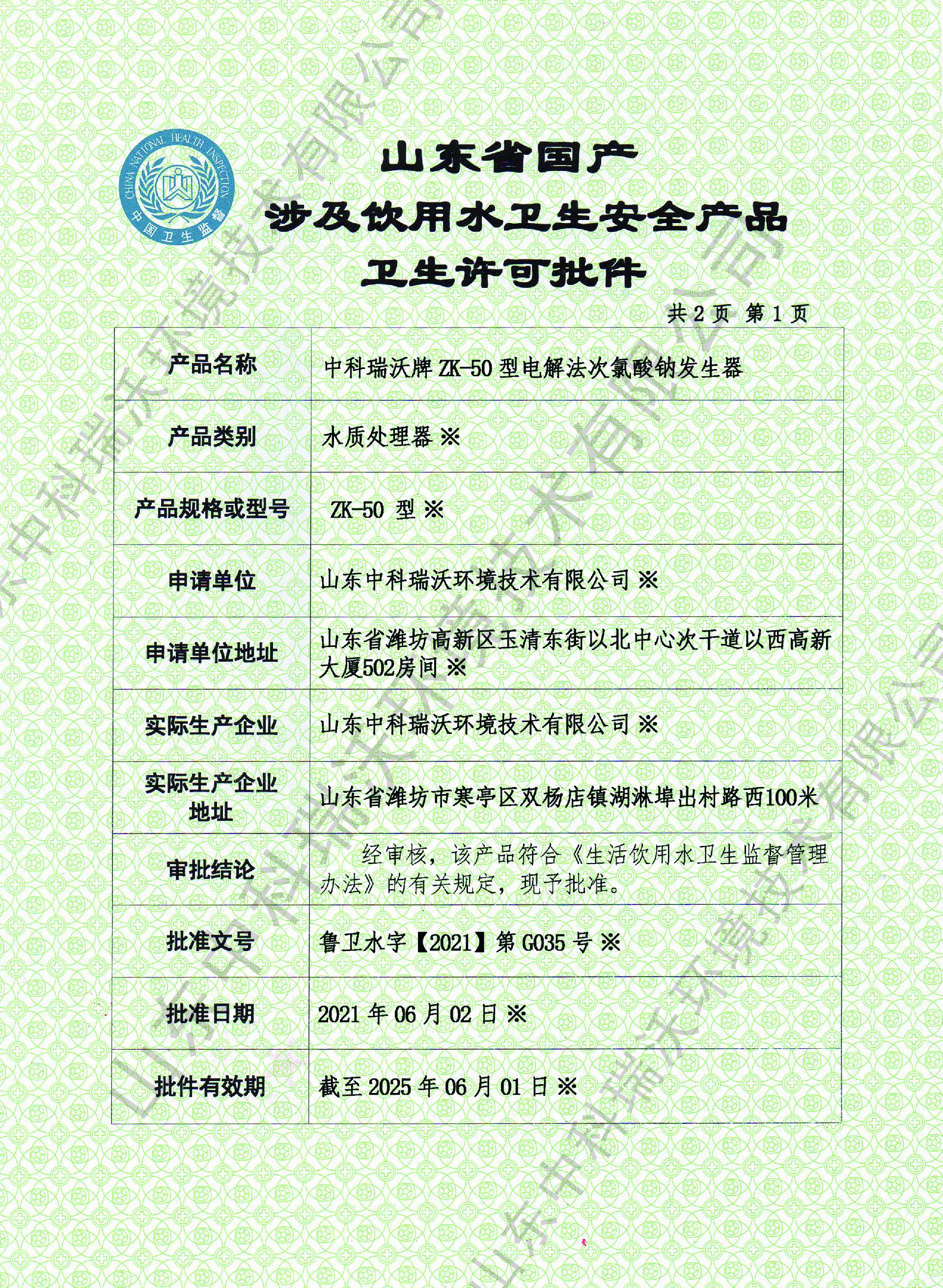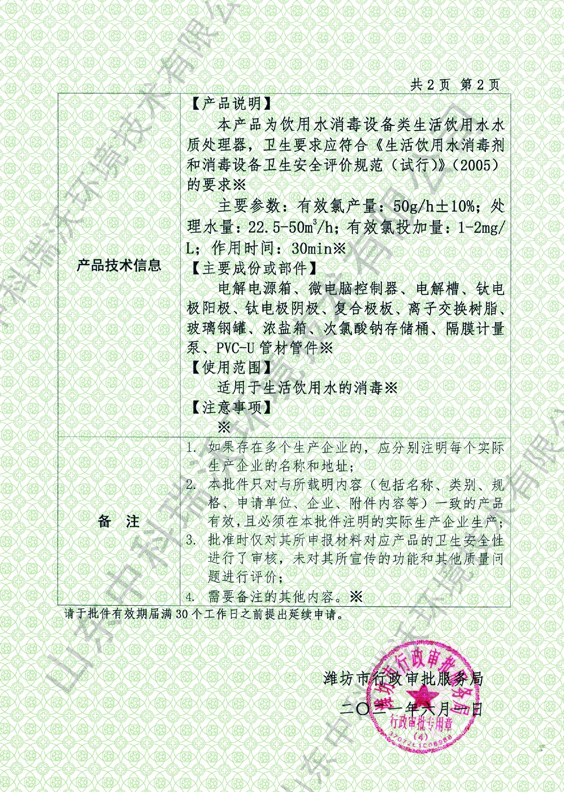 电解次氯酸钠卫生许可批件